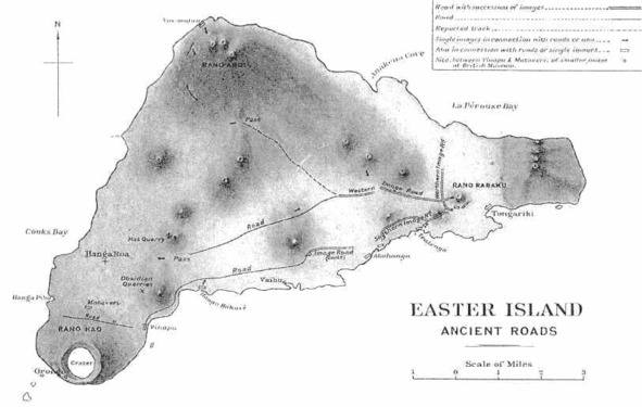 Кэтрин Рутледж обнаружила три основные дороги шириной около 3 м каждая, отходящие от Рано Рараку – рис. 17. Они были обнаружены, когда горизонтальные лучи заходящего солнца, показали углубления в земле. Упавшие статуи лежат вдоль определенных участков дорог, но с очень нерегулярными интервалами. Южную дорогу можно проследить от Рано Рараку, с одним или двумя пробелами, почти до подножия Рано Као. 29 разбросанных статуй лежат вдоль него, большинство более 20 футов в высоту, а некоторые более 30 футов. Другая дорога пролегала через щель в стене кратера в направлении западной части острова. Здесь ни так, как на южной дороге, и имеется 14 статуй, которые установлены все дальше друг от друга с увеличением расстояния от горы. Третья дорога проходит в северном направлении и намного короче двух других. Здесь есть только 4 статуи, покрывающих расстояние приблизительно в милю.