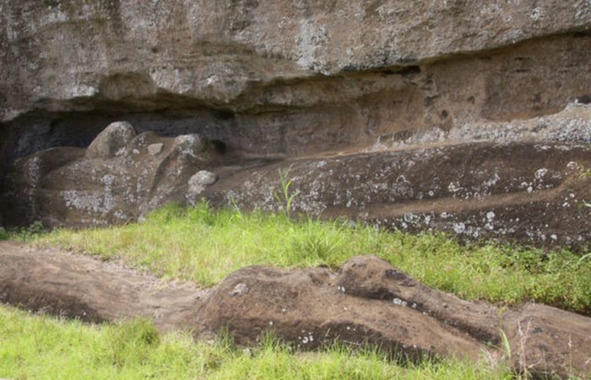 На самом деле, действительность иная. Потому что такая статуя только одна, и она не возвышается на горе Рано-Рораку, а лежит в нише под горой, в самой ее нижней точке. Она не отделена от скального основания. Есть и другие изваяния долгоухих, которые и по замыслу высекались в положении лежа. Где доказательства того, что статую собирались ставить? У. Томсо описал в 1886 году статую, лежащую над устьем Родовой пещеры, в которой хранились черепа предков.
