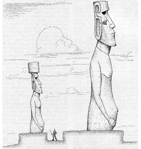 Франсис Мазьер говорит еще более решительно. «Можно предположить все что угодно, но перед лицом 22-метровой законченной статуи (высотой с семиэтажный дом), возвышающейся на горе Рано-Рораку, не устоит никакая логика. Подумайте только, голова и шея – 7 метров высоты и 3 метра в диаметре, длина носа – 3, 4 метра; высота туловища – 13 метров, вес 50 тонн! В настоящее время в мире найдется не очень много кранов, чтобы справиться с подобной махиной».