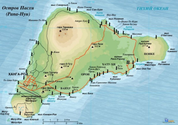 Статуи есть не только на острове Пасхи. В створе или продолжении этого подводного хребта Сала-и-Гомес, в нескольких тысячах километров к западу, находятся острова Питкерн и Раивавае (до острова Питкерна от Рапа-Нуи около 2 тысяч километров, до Раивавае – более 4 тысяч). На этих островах тоже высекались каменные изваяния, некоторые исследователи сближают их с моаи острова Пасхи. Есть гипотеза о том, что все эти каменные статуи высекались каким-то народом-пришельцем с востока или с запада. Но, быть может, сходство статуй объясняется простым сходством вулканических туфов, образовавших острова Пасхи, Питкерн, Раивавае [150]