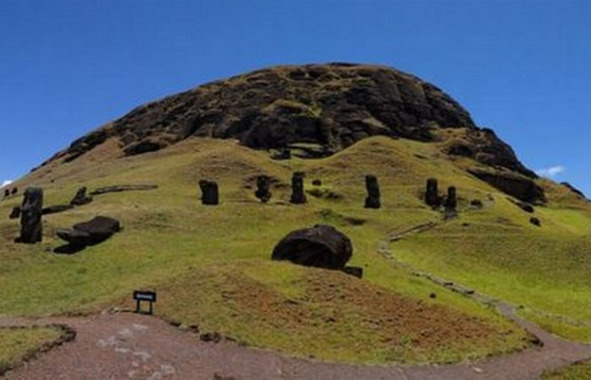 Некоторые из них наполовину погребены в земле, а другие не завершены. А самым увлекательным зрелищем на Рано Рараку являются моаи в карьере. Некоторые из них являются незавершенными, а до других сегодня невозможно добраться, поскольку они расположены очень высоко на внешней стороне кратера. Здесь можно увидеть один из крупнейших образцов моаи, высота которого составляет 21,6 метра. Он почти в два раза больше своих «собратьев», которыми прославилось побережье острова Пасхи [125].