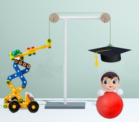 Они быстро привязали шапочку и собрали механизм перемещения из деталей конструктора. Посмотримте, что получилось. Егор управлял механизмом, шапочка надевалась и снималась с головы неваляшки – рис. 1.