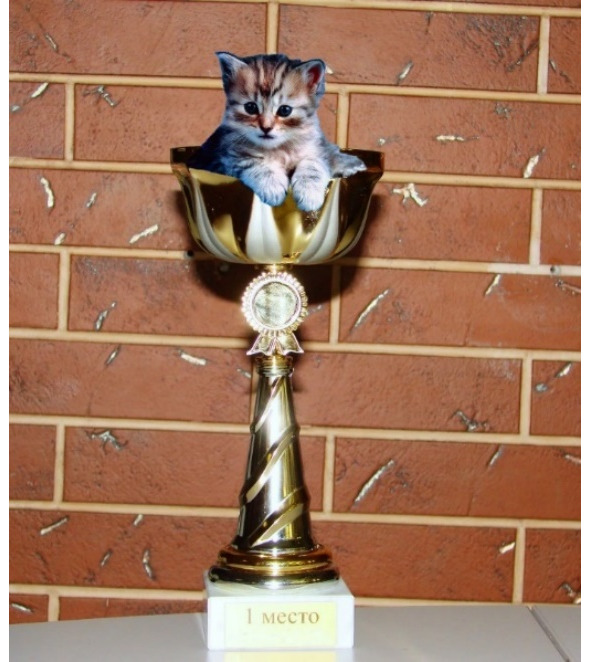 Лена поставила кубок на стол, и все фотографировались рядом с ним. Затем Вика принесла котенка, которого накануне заметила в подсобном помещении. Она посадила котенка в кубок. Посмотрите, вот он красавец в кубке – рис. 6.