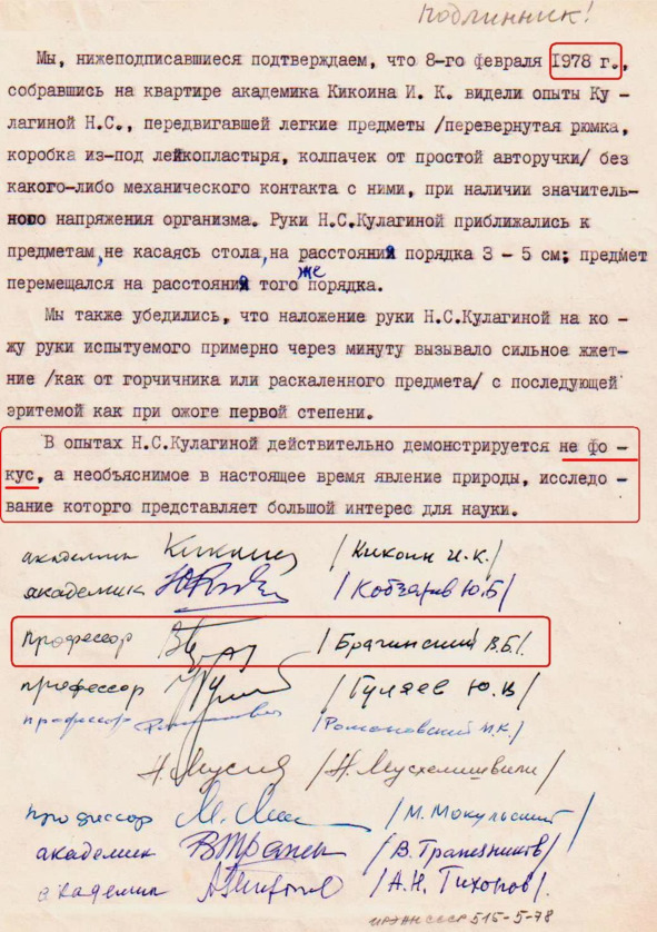 – Смотрите, я специально скачала подлинник письма 1978 года, где четыре академика и пять профессоров подписались под тем, что Нинель Сергеевна Кулагина перемещала предметы, не прикасаясь к ним. Она их передвигала за счет напряжения организма. А еще есть отдельное письмо за подписью академика Юрия Борисовича Кобзарева о том, что излучения от Нинель Кулагиной может привести к фундаментальным открытиям, не уступающим по своему значению теории относительности или квантовой механики – рис. 7.