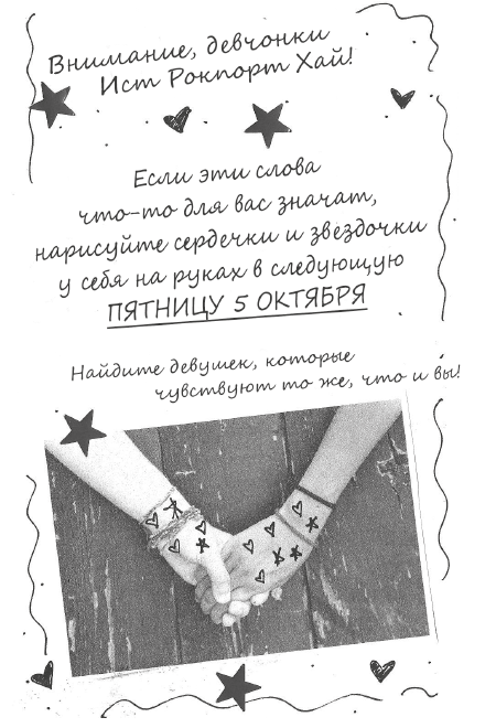 – Видели то, что написано сзади на обложке? – спрашивает Клодия. – Что надо прийти в школу в пятницу со звездами и сердечками на руке? – Она пожимает плечами и поднимает брови. – Не очень-то понимаю, что это значит.