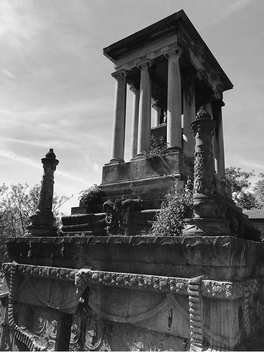 Среди других возрожденных архитектурных стилей на Пер-Лашез – античный храм с ионическими или коринфскими колоннами, часто с декоративными капителями, но он встречается значительно реже, чем готический. Знаменитый ранний пример – мавзолей графини Елизаветы Демидовой (урожденной Строгановой), умершей в 1818 году (ил. 5). Учрежденный только в 1850‐м ее мужем, богатым заводчиком Николаем Демидовым[70], он стоит на склоне кладбищенского холма, a к склепу, в котором находится гробница, ведут ступени. Склеп на высоком постаменте, созданный архитектором Жоне (Jaunet) и скульптором Квалья (Quaglia), возвышался над соседними могилами, и оттуда, с высоты птичьего полета, открывался вид на кладбище[71]. Долгое время склеп считался самым большим памятником на Пер-Лашез.