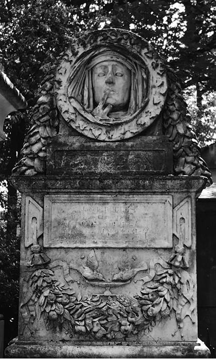 Уникальное романтическое надгробие совсем в ином ключе, с аллегорическим названием «Молчание» (1842), стоит на могиле еврейского предпринимателя Якоба Роблэ (ил. 8). Это в еврейской части Пер-Лашез, недалеко от семейного мавзолея Ротшильдов[76]. На мраморном декоративном медальоне изображена загадочная фигура молчания смерти, необычным образом тематизирующая промежуточность жизни и смерти. Живая жизнь, растительная и птичья, окружает голову женщины, жестом призывающей к молчанию. Выполненная Огюстом Прео скульптура была воспринята в свое время как пример нового искусства. Среди прочих она повлияла на Одилона Редона, известного художника-символиста, у которого есть похожая картина с тем же названием (1911)[77].