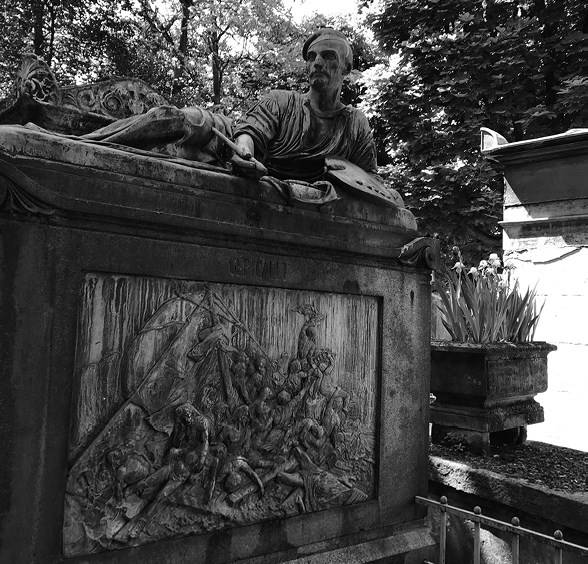 Один из приметных памятников принадлежит раннему живописцу-романтику Теодору Жерико, умершему в 1824 году (ил. 9). На передней стороне гробницы изображена самая известная его работа «Плот Медузы» (1819) в виде горельефа[78]. Сверху полулежит утомленный художник; с кистью в одной руке и палитрой в другой, он смотрит вдаль, словно пишет именно «Медузу». Большой бронзовый надгробный памятник, установленный на могиле в 1884 году, выполнил признанный французский скульптор и художественный критик Антуан Этекс.