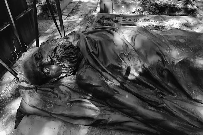 Описывая интересные и необычные памятники садово-парковых парижских кладбищ, изначально находившихся вне города, особое внимание я уделяю художественным характеристикам кладбищенских жанров: мавзолеев в виде усыпальниц, плакальщиц, портретных надгробий и проч., – а также избранным оригинальным памятникам. Выделенный мною жанр реалистической эффигии (лежащего на могиле трупа в натуральную величину) изображает состояние тела между жизнью и смертью – в отличие от старых транзи, изображающих разлагающийся труп (репрезентация жуткой стороны смерти, которая перестала фигурировать в конце XVII века). Некоторые памятники, созданные в этом жанре, изображают человека на том месте, где он был убит или умер: известные мужские эффигии, появившиеся во второй половине XIX века, обычно принадлежат революционерам, а также убитым на дуэли или в катастрофе. Важно и то, что они полностью опровергают вертикальность – один из основных параметров кладбищенского пространства.