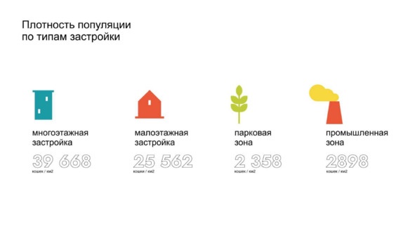 Данные о количестве промзон и парковых территорий были взяты из открытых источников, данные по малоэтажной и высотной застройке – из конструктора сервиса «Яндекс Карты». В конструкторе карт выделялись учётные площадки таким образом, чтобы их площадь составляла ровно один квадратный километр.