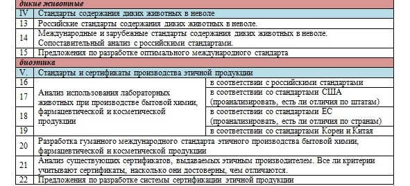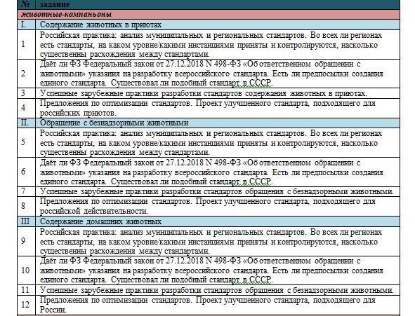 Изучение стандартизации и сертификации в области комфортного сосуществования людей и животных реализуется в рамках изучения дисциплины «Экологическая стандартизация и сертификация» при подготовке бакалавров по специальности «Экология и природопользование» на кафедре Международных комплексных проблем природопользования и экологии МГИМО МИД России. Обращение к данной тематике – элемент реализуемого на кафедре трандисциплинарного подхода к изучению проблемы обеспечения комфортного сосуществования людей и животных на урбанизированных территориях. В рамках изучения вышеуказанной дисциплины студенты получают знания об управлении качеством, метрологии, стандартизации, сертификации, взаимодействии в системах сертификации органов по сертификации, аккредитованных лабораторий; экомаркировке; нормативно-правовых актах в данной области в России, Таможенном союзе ЕАЭС и т.п.. На примерах стандартов и сертификации зелёного строительства и строительных материалов, устойчивого лесопользования и иных эколого-ориентированных систем добровольной сертификации у студентов формируются знания, которые могут быть востребованы во время прохождения производственной и преддипломной практик, в будущей профессиональной деятельности. Однако следует отметить, что если о сертификации BREAM, LEED, FSC, MSC, ECOSERT и некоторых других студенты могут почерпнуть знания на сайтах организаций разрабатывающих соответствующие стандарты и сертифицированных в данных системах сертификации, в немногочисленных статьях и учебных пособиях, то знания о стандартизации и сертификации в сфере взаимодействия людей и животных в учебной и специальной литературе практически не отражены, что связано, с одной стороны, с отсутствием ярко выраженной коммерческой составляющей данного направления в стандартизации и сертификации и с определённой новизной зоозащитной тематики в нормативно-правовых актах в России, а как следствие – со слабой представленностью и институционализацией этичного отношения к животным в программах образовательных учреждений. Для восполнения указанных пробелов АНО «Социально ориентированная ветеринария» был разработан комплект заданий – табл.1.
