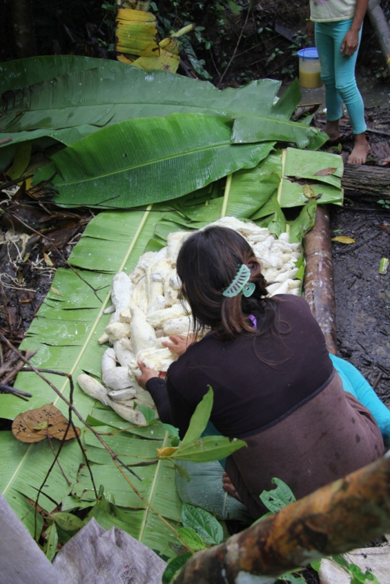 Очищенные клубни горького маниока разламывают руками на мелкие кусочки