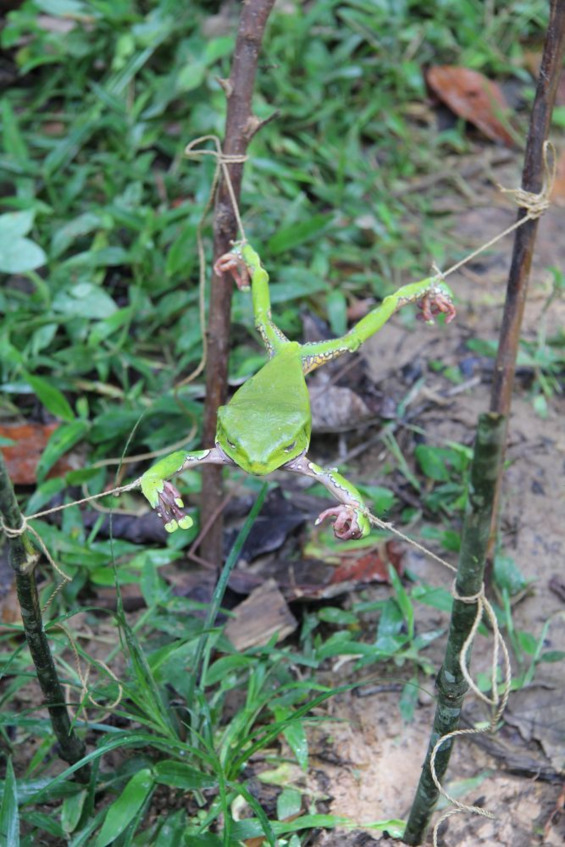 Чтобы снять с лягушки ядовитую слизь, ее распинают на колышках параллельно земле