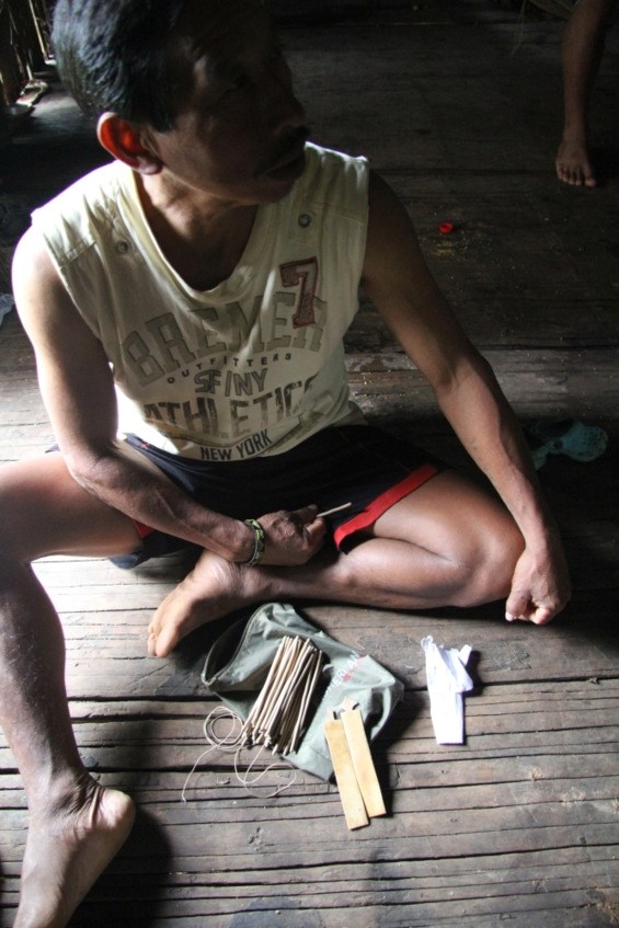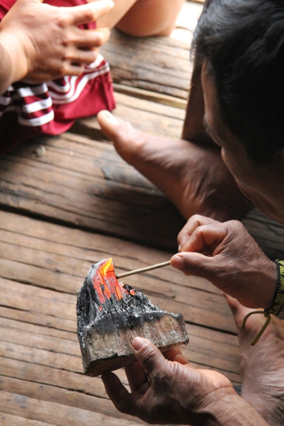 Хорхе хвастается, что он способен добыть огонь при помощи трения, используя для этого древко стрелы и комочек хлопка.