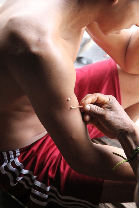 Одному из членов семьи Шавы показалось, что он чувствует себя не очень хорошо, и вечером мацес решили использовать ядовитую слизь лягушки для улучшения его самочувствия. У Шавы уже имелся запас акатé; он нанес небольшую порцию ядовитой слизи на две плоские узкие дощечки, специально предназначенные для этого, которые на языке мацес называются даукэт. Две-три минуты он неспешно перемешивал ее деревянной короткой, заостренной с одного конца палочкой, именуемой мацес аяш. Затем, видимо убедившись, что слизь приобрела нужную консистенцию, Шава отложил в сторону даукэт и аяш и взял в руки тлеющую головешку. Заостренный конец аяш он приложил к головешке. Горячим кончиком аяш Шава один раз прикоснулся к бицепсу молодого человека, решившего принять акатé; в этом месте у него на коже от ожога образовалось маленькое круглое пятнышко. Двумя сантиметрами ниже Шава прижег ему второе пятнышко; немного подождав, он легко сковырнул ногтем верхний слой обожженной кожи; под ней забелел эпидермис. Заостренным чистым кончиком другой аяш он нанес на свежие ранки по капле ядовитой слизи, после чего испытуемый сразу вышел из дома и отошел в сторону. Примерно через две минуты его стало тошнить; молодой человек стоял, держась за ствол дерева. Мацес поясняют, что как только акатé проникает в тело, у человека возникает головокружение, подступает тошнота, теряется ориентация в пространстве. Несколько минут молодой человек фиксировал свое положение, опираясь на дерево, его шатало, и он интенсивно отхаркивался; спустя какое-то время неровной поступью он побрел к себе в хижину спать. Смеркалось.
