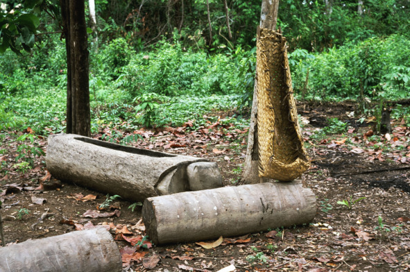 У своей хижины ябарана оставили корыто для пива, украшенное вырезанными головами ягуаров