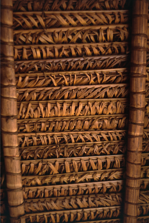 Осокообразные листочки одной стороны стебля загибают, поворачивают на 180 градусов параллельно листочкам другой стороны. В таком сложенном пополам состоянии пальмовый лист оставляют под гнетом на солнцепеке. После того как листья полностью высохнут, получаются готовые заготовки. На жерди крыши их укладывают, начиная снизу вверх, параллельно земле, очень плотно подгоняя одну заготовку к другой таким образом, чтобы осокообразные листочки шли плотным настилом один на другой сверху вниз. При этом каждую заготовку аккуратно привязывают лианами во всех местах ее пересечения с жердями – получается надежная водонепроницаемая крыша, которой не страшен ни один тропический ливень и которая прослужит своим хозяевам несколько лет.