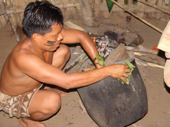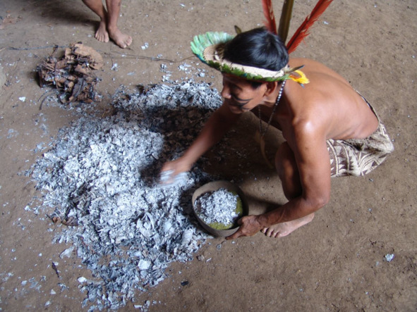 Пепел от сгоревших листьев Cecropia peltata перемешивают с растолченными листьями коки