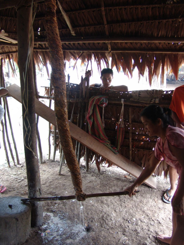 Скрученная циновка выполняет функцию пресса, через который проливается вода, вместе с которой из маниоковой массы вымываются токсины