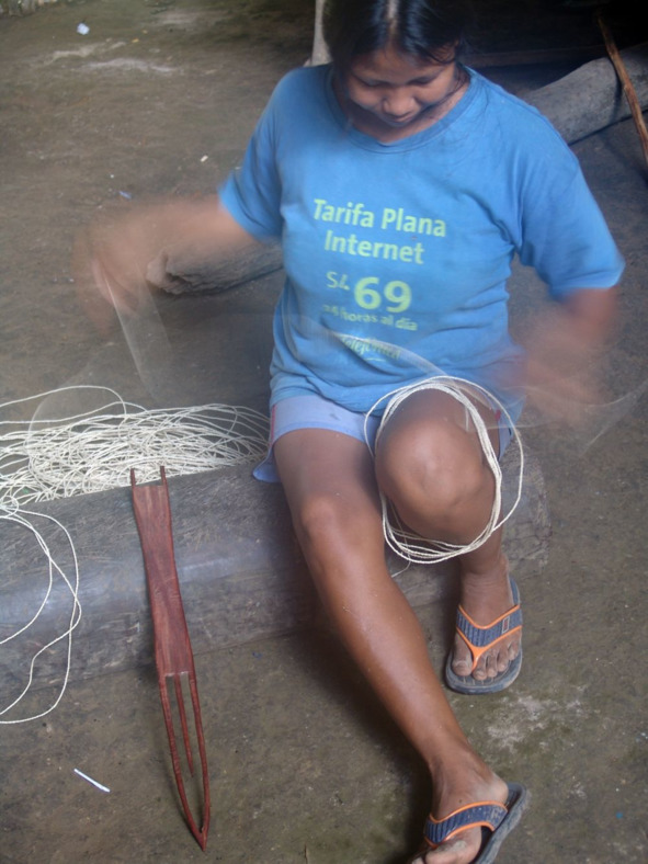 Женщина бора с деревянным челноком, используемым для плетения гамака