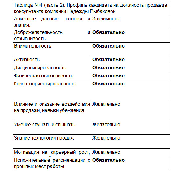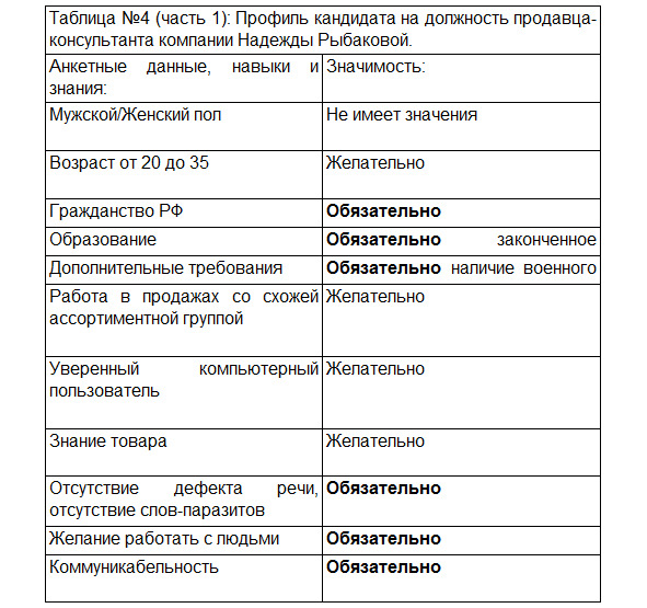 Надежда закончила читать и широко улыбнулась. Она раздобыла у коллег профиль кандидата (таблица № 4 часть 1 и 2), которым пользовались все в отделе, положила этот документ на стол перед собой и начала сравнивать.