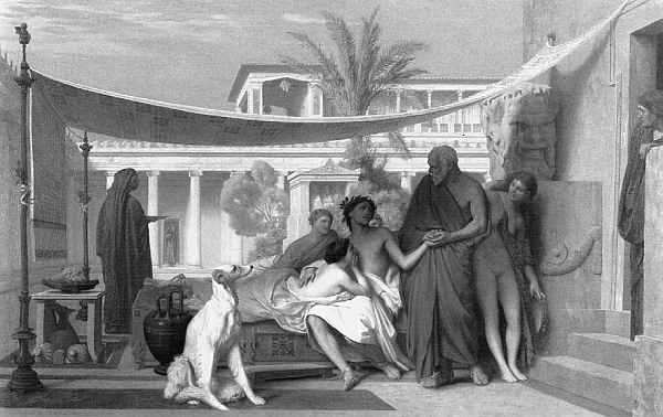 Отрубив хвост любимой собаке, Алкивиад с выгодой для себя сменил повестку дня в Афинах. На илл.: Жан-Леон Жером. Сократ находит Алкивиада в доме Аспасии (1861).