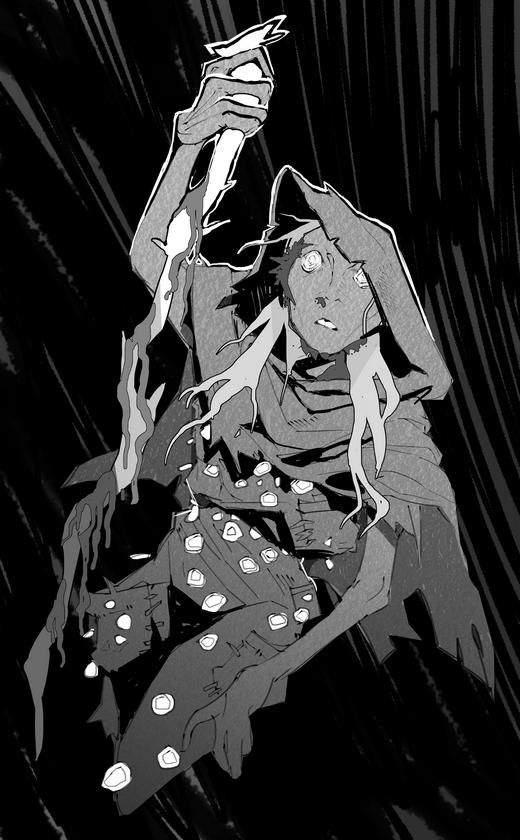 Тень оказалась женщиной. Она шла неторопливо, сгорбившись. Каждое её движение сопровождалось многочисленным лёгким звоном. Что-то у неё было с лицом… На подбородке, под носом и на висках налип зеленоватый мох. Форма была какая-то… неправильная. Будто из мостовой вытащили один из камней, выдолбили в нём нос, глаза, брови, скулы, губы и вставили под капюшон.