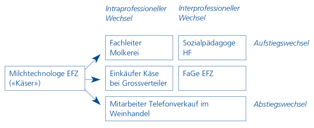 •Wechsel in einen der ursprünglichen Tätigkeit völlig fremden Beruf – wir sprechen in einem solchen Fall von interprofessionellem Wechsel –, zum Beispiel von der kaufmännischen Angestellten zur Pflegerin, vom Bauer zum Bäcker (→ Abbildung 3-1). Solche Wechsel sind in der Schweiz eher selten, meist erfolgen sie eher aus persönlichem Antrieb oder als Folge von Unfällen oder Krankheiten.