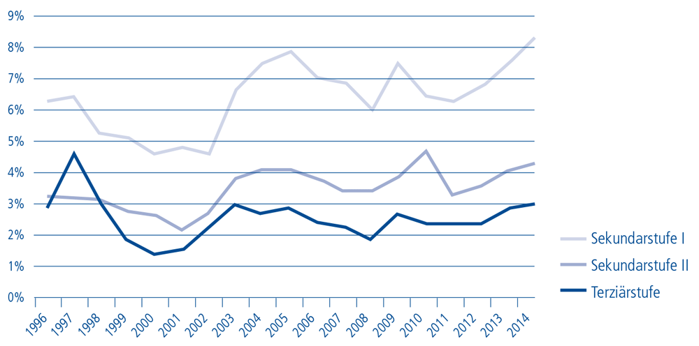 Fehlende (Berufs-)Ausbildung ist einer der zentralen Faktoren, die das Risiko für Arbeitslosigkeit und Sozialhilfeabhängigkeit erhöht: Personen ohne berufliche Grundausbildung und solche, die im erlernten Beruf nicht mehr arbeiten können, verursachen der Gesellschaft vermehrt Kosten. Die «Working-Poor-Quote» der Erwerbstätigen ohne nachobligatorische Ausbildung ist 2,7-mal höher als der Durchschnitt (11,4 %) (BFS, 2007). Von den Erwerbstätigen in sogenannten Tieflohnstellen verfügen 32 Prozent über keine Berufsausbildung, weitere 44 Prozent über keinen eidgenössisch anerkannten Abschluss (BFS, 2012). Personen ohne Abschluss auf Sekundarstufe II sind weniger häufig erwerbstätig (70 %) als der Durchschnitt der Bevölkerung (83 %) (von Erlach, 2015). Die Erwerbslosenquote liegt deutlich höher als bei Personen mit höheren Abschlüssen, 2014 mit 8,3 Prozent doppelt so hoch wie bei Personen mit Abschluss auf Sekundarstufe II – und die Kluft wird ständig grösser (→ Abbildung 3-2; Ruch et al., 2015, S. 25). Die Armutsquote ist mit 13,9 Prozent doppelt so hoch wie diejenige von Personen mit einem Abschluss auf Sekundarstufe II (7,3 %) (Ruch et al., 2015, S. 99).