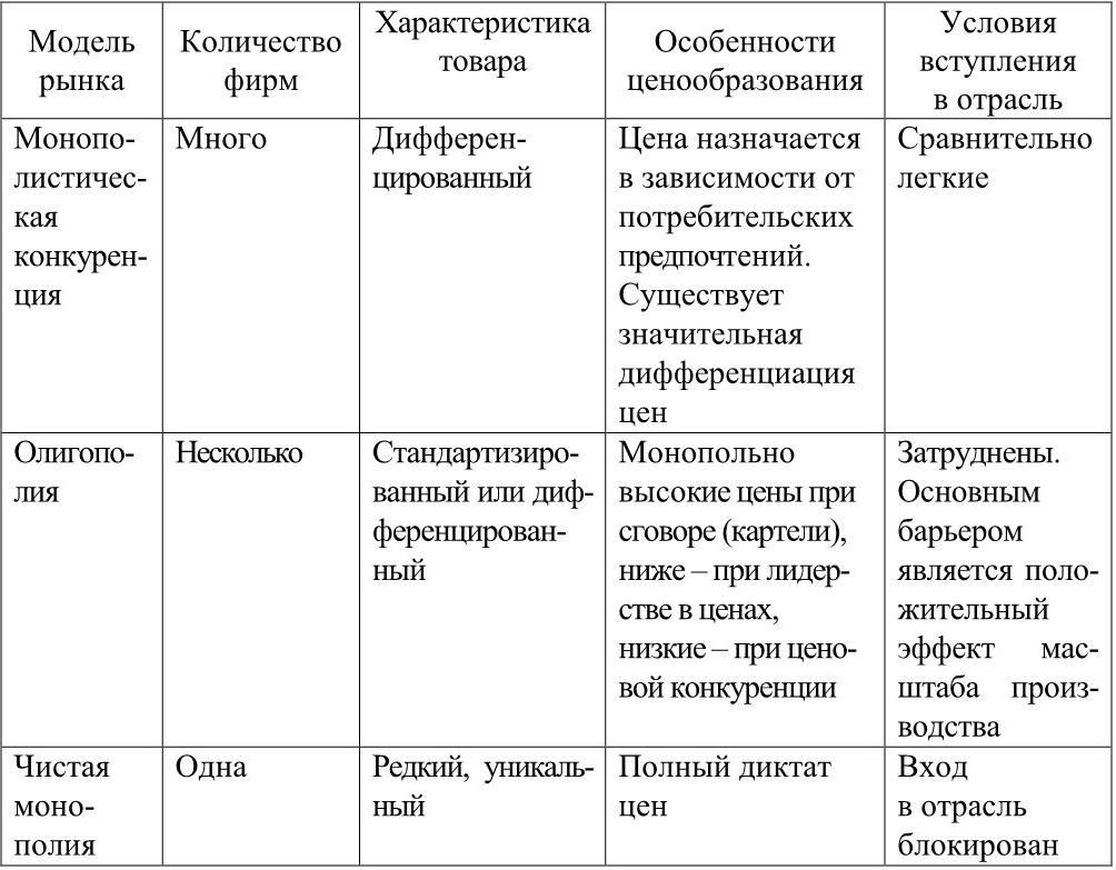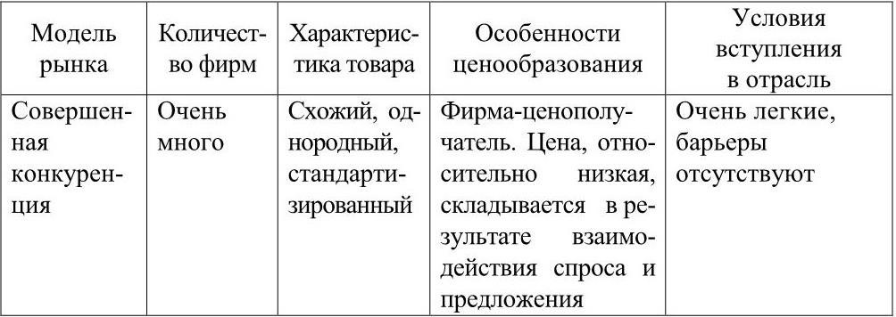 Поскольку структура того или иного рынка определяется множеством факторов, количество типов рынков является практически неограниченным. Для упрощения анализа в экономической теории принято выделять четыре базовых модели: совершенная конкуренция, чистая монополия, монополистическая конкуренция и олигополия. Модели конкурентных рыночных структур приведены в табл. 1.2.