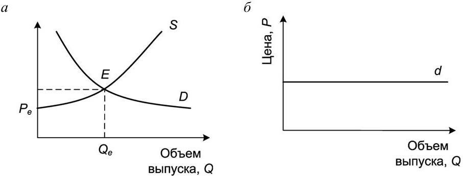 а – рыночного спроса; б – спроса на продукцию отдельной фирмы; E – точка равновесия; S – кривая рыночного предложения