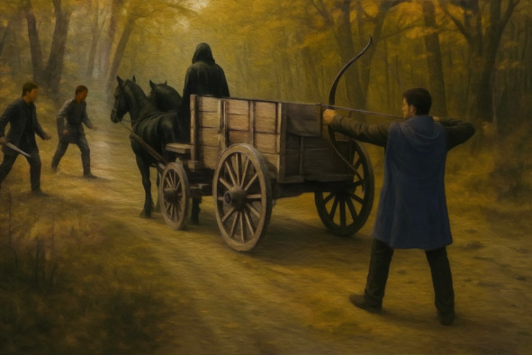 Ночь ложилась на тракт. На темнеющем своде небес всё яснее показывались звезды. Лошади шли неохотно. Телега дребезжала и громко скрипела колёсами. Стрелок беспокойно озирался по сторонам. Много лет ночная тьма верно служила ему и была залогом успешных ограблений. И вот впервые разбойник ощутил себя на месте беспомощной жертвы в этой самой темноте.