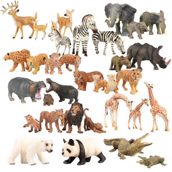 How many toys you have! I see a lot of plastic animals. There is a tiger, a lion, a zebra, a leopard, a hare and others. Our game is called «The Zoo».