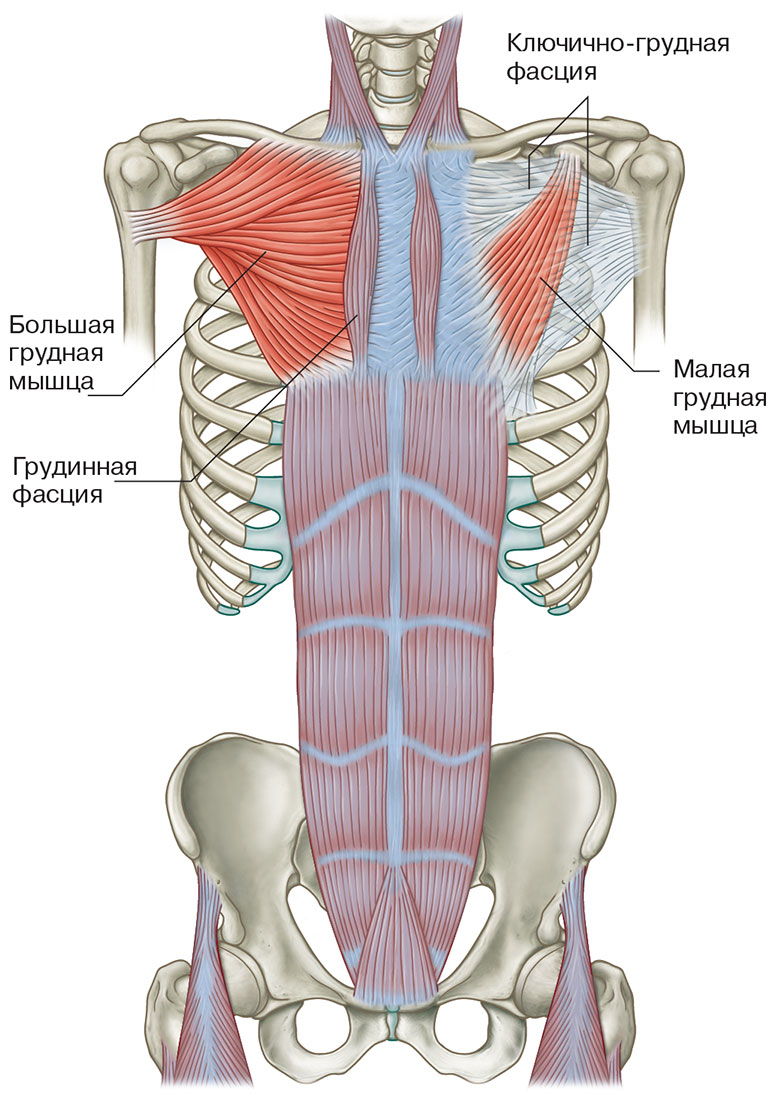На грудинной мышце и ее фасции можно иногда «побренчать как на гитаре», проводя пальцами в горизонтальном направлении над пятым ребром и медиальнее грудных мышц. А фасцию, пролегающую над грудино-хрящевыми суставами, можно легко прощупать на неровных внешних краях грудины.