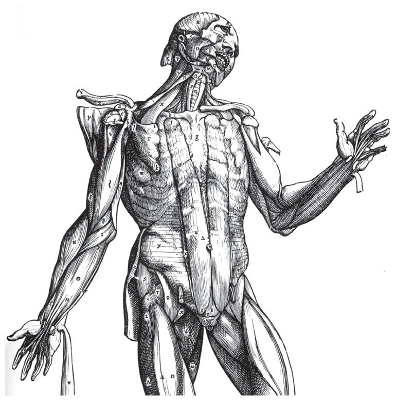 Рис. 4.20. Везалий, которого можно считать одним из первых предшественников теории миофасциальных меридианов, показывает, что фасция прямой мышцы живота поднимается вверх почти до ключицы. Почему? (Воспроизведено с разрешения Saunders JB, O’Malley C. Dover Publications; 1973 г.)