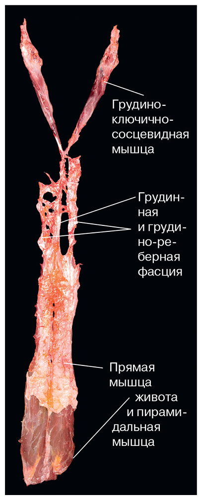 Своенравная поверхностная грудинная мышца часто представлена не мышечно, а фасциально. Независимо от того, как она представлена, ПФЛ поднимается вверх от прямой мышцы живота по легко пальпируемым фасциальным слоям. Она проходит над грудиной, грудинно-хрящевыми суставами и реберными хрящами, вплоть до начала грудино-ключично-сосцевидной мышцы. Мы подозреваем, что большие напряжения передаются через грудину механически, а также фасциально, через эти фасциальные слои и грудинную фасцию.