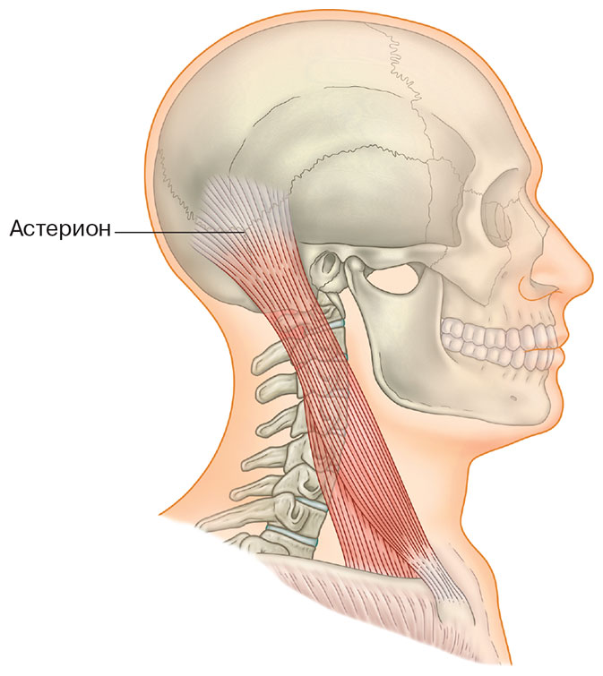 Рис. 4.22. Четвертой и самой верхней порцией ПФЛ является грудино-ключично-сосцевидная мышца (ГКСм), которая проходит по шее назад и прикрепляется к задней части височной кости и астериону – шовному соединению между височной, теменной и затылочной костями. К этому же месту, но только изнутри черепа, крепится намет мозжечка
