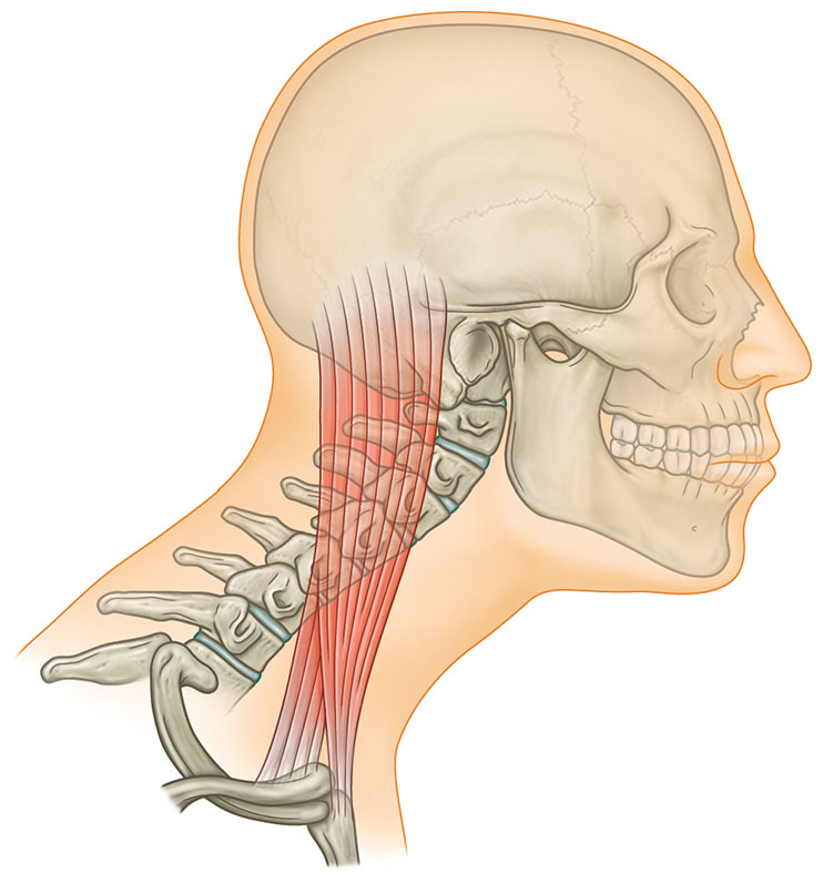 Рис. 4.23. ГКСм обладает уникальным расположением, позволяющим ей при вертикальном положении тела создавать сгибание нижней части шейного отдела и разгибание верхней части шейного отдела. Конкретный уровень шейного отдела, в котором происходит такое переключение, зависит от осанки, но чаще всего это позвонки С2-С3 или С3-С4