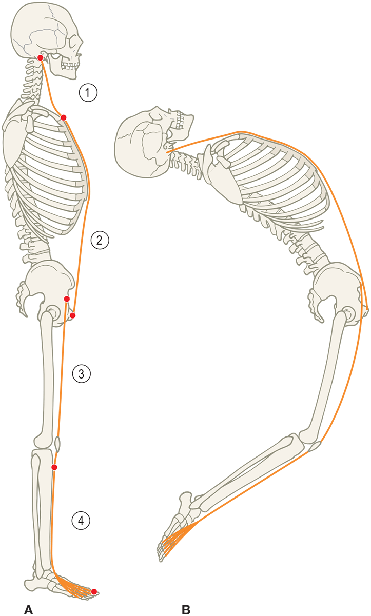 Мышцы, входящие в состав ПФЛ, создают тыльное сгибание в голеностопном суставе, разгибание в колене, сгибание туловища и тазобедренного сустава. В области шеи действие ПФЛ зависит от расположения тела в пространстве относительно действия силы тяжести: в положении лежа она сгибает шею и поднимает голову; в положении стоя ГКСм создает сгибание в нижнем шейном отделе и разгибание в верхнем шейном отделе (см. Обсуждение 4.2 ниже). В то же время ПФЛ удлиняется, обеспечивая полное выпрямление и разгибание туловища и сгибание коленей. Таким образом, для мобилизации ПФЛ можно использовать различного рода наклоны назад и растяжки передней части ног, например, выпады. Постуральное сгибание туловища, выдвинутая вперед голова или заблокированные колени являются признаками чрезмерного сокращения ПФЛ.