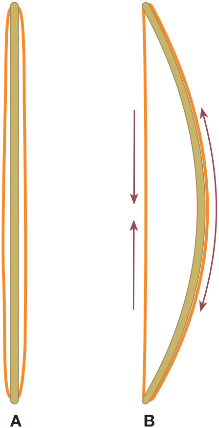 Представьте себе полоску бальзового дерева с натянутой по обеим сторонам резинкой (рис. 4.28A). По мере того как резинка с одной стороны укорачивается, древесина изгибается, неизбежно растягивая резинку с другой стороны (рис. 4.28B).