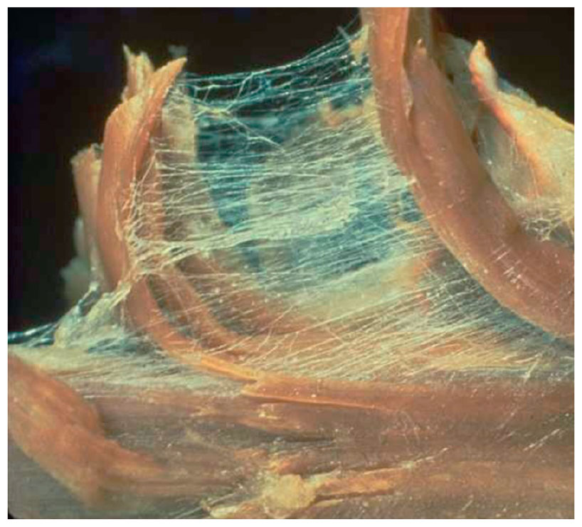 Рис. 1.9. Это увеличенное изображение миофасции – перимизий, который покрывает каждый мышечный пучок (нейромоторную единицу). По своему строению он напоминает «сахарную вату». Волокна фасции плотно переплетены с мясистыми (и всклокоченными) мышечными волокнами. (Воспроизведено с любезного разрешения Рональда Томпсона.)