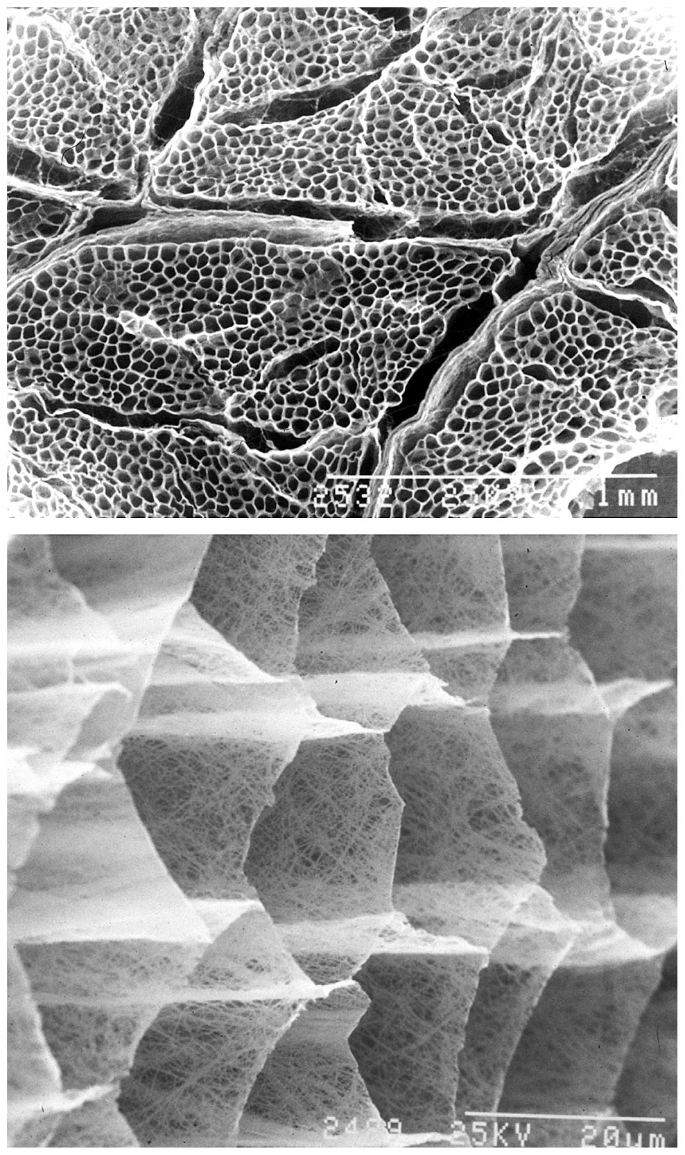 Рис. 1.11. Эти изображения, полученные с помощью электронного микроскопа, показывают, что создание классификации фасций внутри нашей фасциальной системы – это лишь попытка разделить на категории непрерывную и бесшовную сеть, которая постоянно самовосстанавливается, чтобы противостоять действующим на нее силам. (Перепечатано из журнала Bodywork and Movement Therapies, Vol 14, Purslow PP, Muscle fascia and force transmission, стр. 411–417, Copyright 2010, с разрешения Elsevier.)