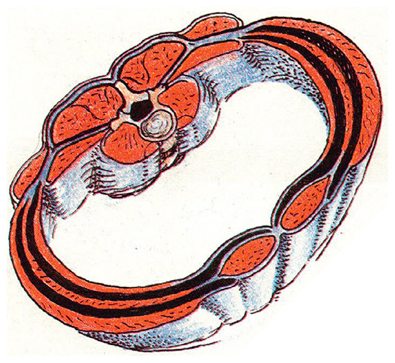 Рис. 2.14. На рисунке показаны пять более или менее прямых продольных линий (считая левую и правую Латеральные Линии за две), отображенные на поперечном сечении тела позвоночного (как будто вы смотрите на срез рыбы). Обратите внимание на взаимодействие между самими линиями, а также между линиями и основными органическими структурами