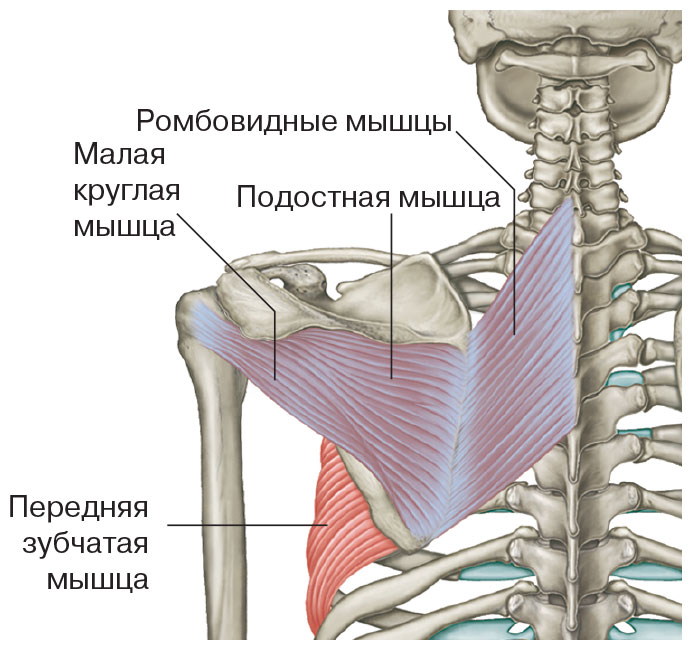 Рис. 2.11. Пример «стрелки»: от большой ромбовидной мышцы усилие передается либо на переднюю зубчатую мышцу по «пути», проходящему вокруг туловища (мышца под лопаткой, обозначенная красным цветом – часть Спиральной Линии, см. рис. 2.7 и Гл. 6), либо в подостную мышцу по другому «пути», проходящему к руке (часть Глубинной Задней Линии руки, см. Гл. 7)
