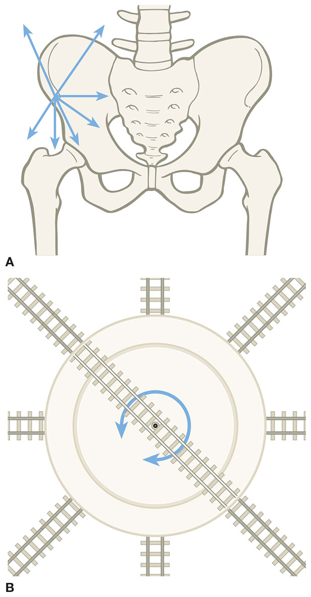 «Депо» – это место, где встречаются и/или пересекаются сразу несколько векторов миофасциальной силы; примерами «депо» являются лобковая кость или передняя верхняя подвздошная ость (рис. 2.12). «Депо» нередко являются костными ориентирами миофасциальных «путей». Их положение имеет решающее значение для анализа структуры по схеме Анатомических поездов, так как через них проходят конкурирующие силы натяжения.