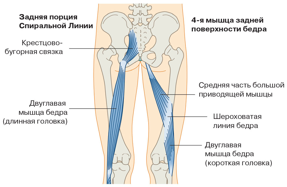 Рис. 2.13. Длинная головка двуглавой мышцы бедра – это двухсуставный «экспресс», часть Cпиральной Линии (слева). Под ней проходят односуставные «электрички»: короткая головка двуглавой мышцы бедра соединяется через шероховатую линию бедренной кости со средней частью большой приводящей мышцы (справа). Соединение образованно плотным пересечением их фасциальных тканей. Функция этих двух «электричек» аналогична функции одного «экспресса»