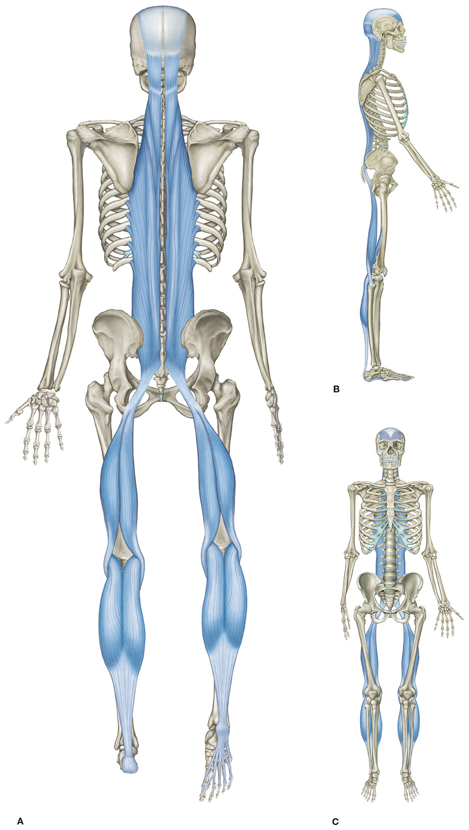 Общая постуральная функция ПЗЛ заключается в том, чтобы поддерживать тело в вертикальном положении и предотвращать его скручивание в позу эмбриона. Так как данная постуральная функция осуществляется на протяжении всего дня, для ее выполнения требуется, чтобы в мышечной части этого миофасциального единства преобладали более медленные, выносливые мышечные волокна. Кроме того, для поддержания такого положения необходимо, чтобы фасциальная часть состояла из сверхплотных пластов и областей, таких как, например, подошвенный апоневроз, ахиллово сухожилие, фасции мышц задней поверхности бедра, крестцово-бугорная связка, грудопоясничная фасция, «тросы» мышц, выпрямляющих позвоночник, и широкая выйная связка у затылочного гребня.