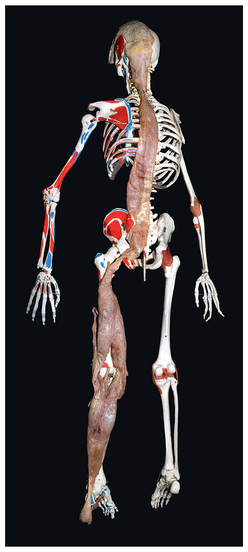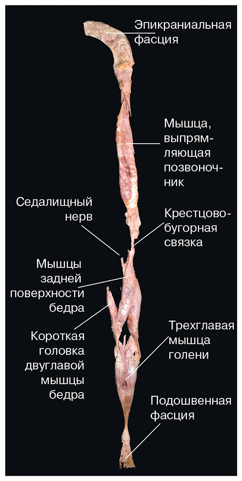 Рис. 3.3. Диссекция Поверхностной Задней Линии, целиком выделенной из тела. На изображении отмечены отдельные ее части. Но глядя на это разделение, становится очевидным, что фокусирование внимания на отдельных анатомических «частях» тела ограничивает мышление и что логичнее рассматривать эти меридианы как функциональные «единства»