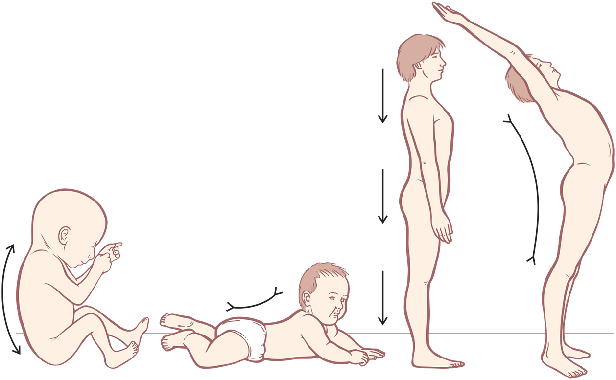 За исключением сгибания коленей, общая двигательная функция ПЗЛ состоит в выпрямлении и разгибании. В процессе развития человека именно мышцы ПЗЛ поднимают голову ребенка из положения сгибания, характерного для эмбриона. Это происходит благодаря постепенной активации глаз и желанию исследовать окружающий мир взглядом. При дальнейшем развитии мышцы ПЗЛ обеспечивают все большую поддержку в различных положениях тела ребенка относительно земли – лежа на животе, сидя, стоя на коленях и на ногах – по мере того, как ребенок достигает стабильности на каждом из этапов развития, пока в конце концов не окажется в вертикальном положении спустя примерно год после рождения (рис. 3.5, см. также рис. 10.38–10.44).