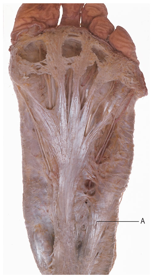 Рис. 3.7. Диссекция подошвенной фасции. Обратите внимание, что латеральный тяж (А) создает отчасти отдельный, но связанный «путь» (©Ralph T. Hutchings. Воспроизведено с любезного разрешения McMinn и соавт., 1993.)